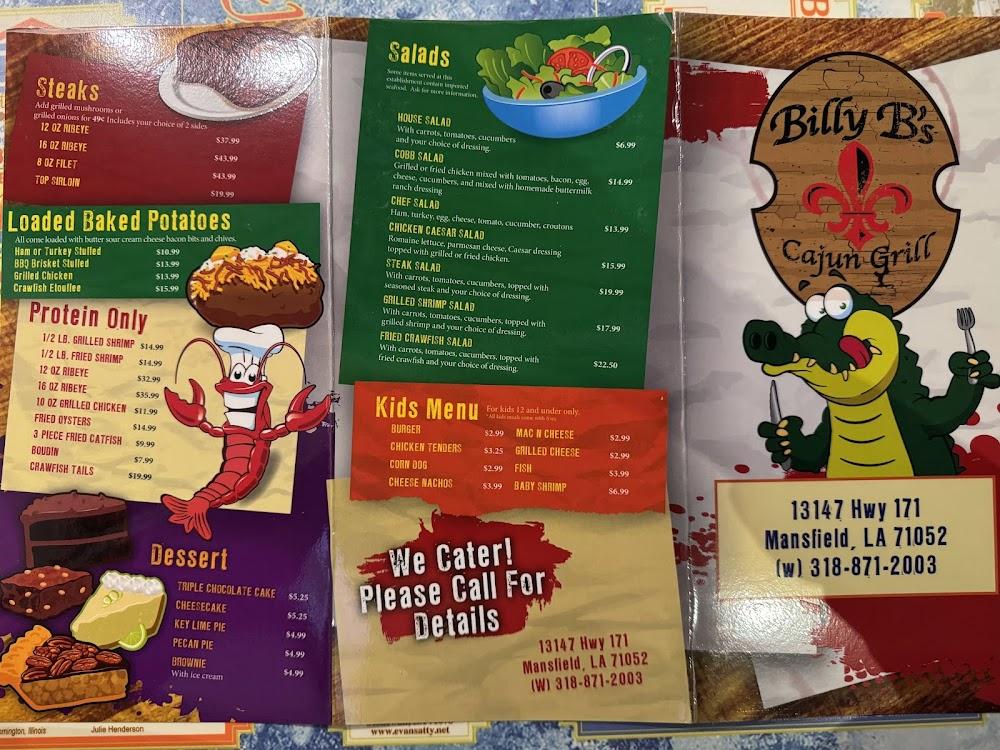 Welcome to Billy B's Cajun Grill, your go-to spot for authentic Cajun cuisine nestled in Mansfield, LA. Enjoy a relaxed atmosphere while savoring our delicious local specialties, from delectable appetizers to mouthwatering desserts. Whether dining in, taking out, or enjoying our outdoor terrace, we cater to every preference with amenities like fast service and a robust drink selection, including craft beers and exquisite cocktails. Perfect for lunch, dinner, or solo dining, our restaurant is wheelchair accessible and ideal for groups and tourists alike. Come experience the vibrant flavors and warm hospitality that define quintessential Cajun dining!