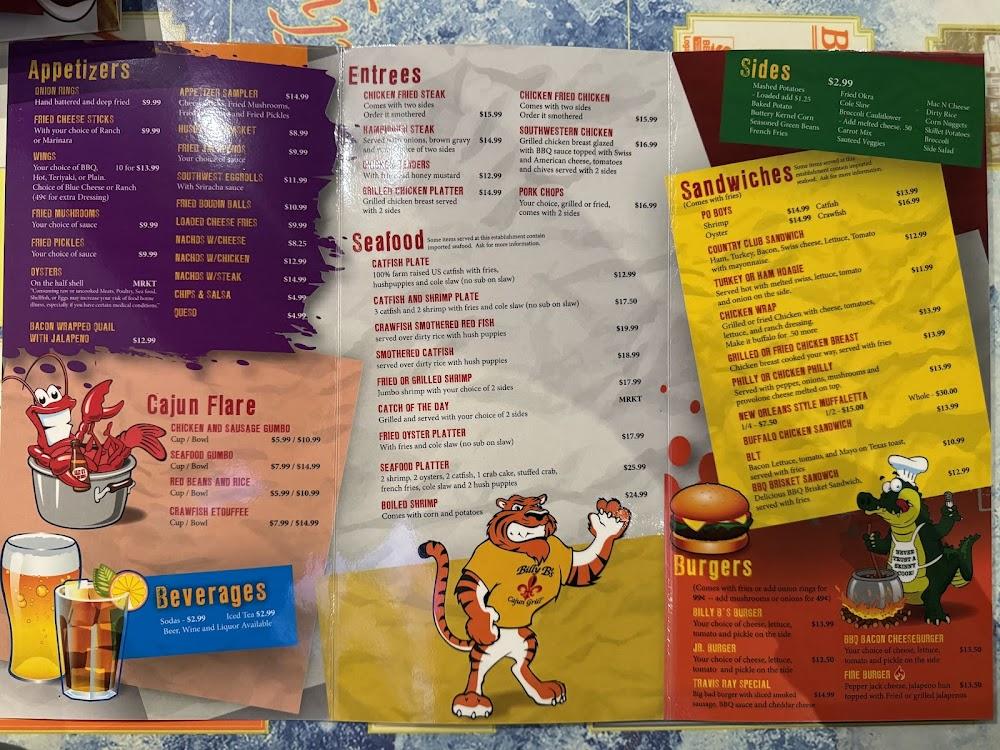 Billy B's menu reflects a wide range of flavors. Highlights include seafood gumbo, chicken and sausage gumbo, and loaded baked potatoes stuffed with crawfish etouffee. The offerings cater to diverse tastes and preferences.